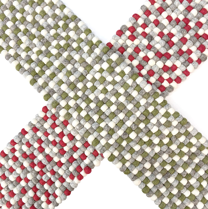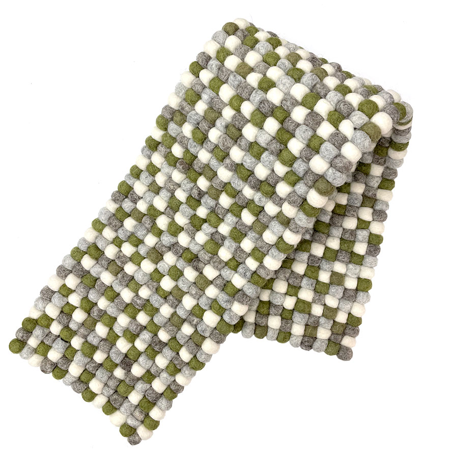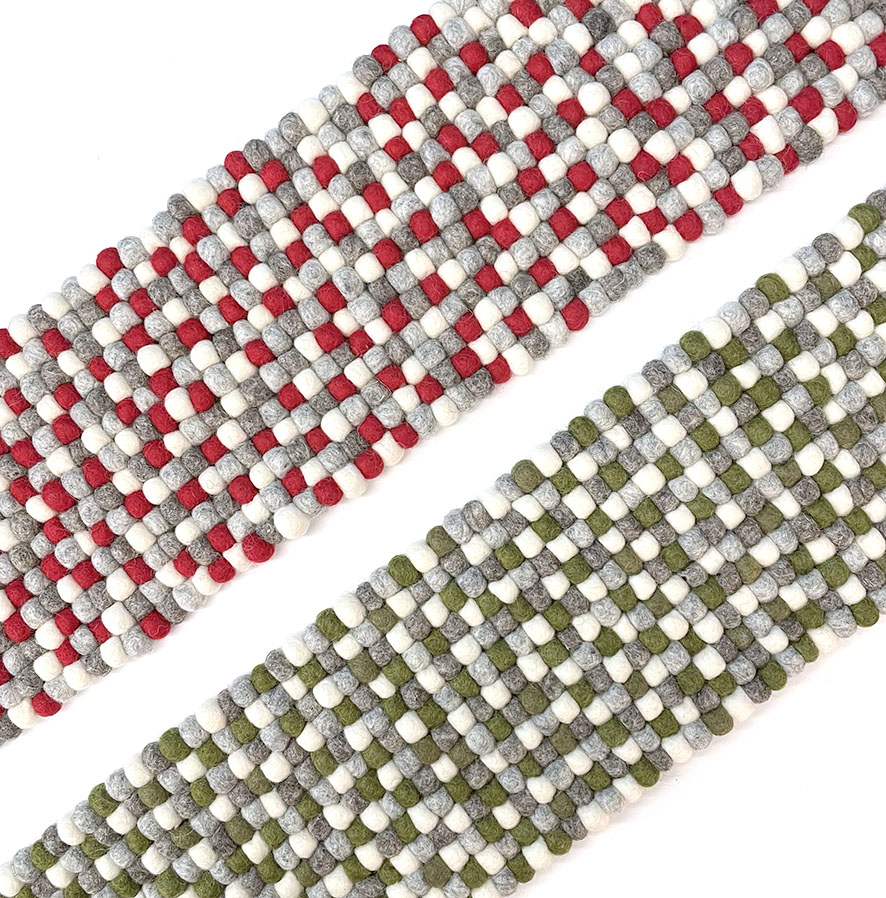 Bordløperne er satt sammen av 1 cm håndlagde filtkuler og er 15 cm brede og 60 cm lange. Produsert for FORUT av Nepal Craft Gallery i Katmandu. Fås i gråtoner med grønn eller rød. (Fargegjengivelsen på skjerm kan avvike fra virkeligheten).