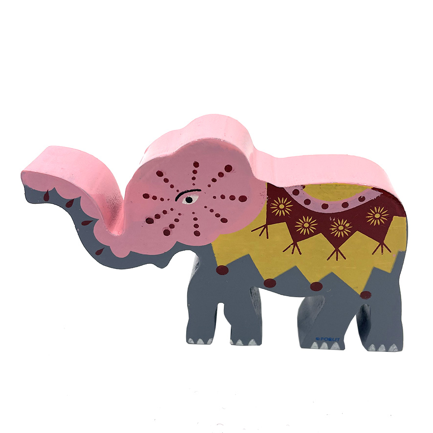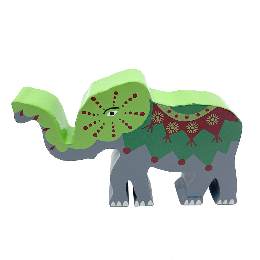 Elefant i tre. Fargerikt dekorert til festivalen Perahera. Figurene er ca 12×8 cm.