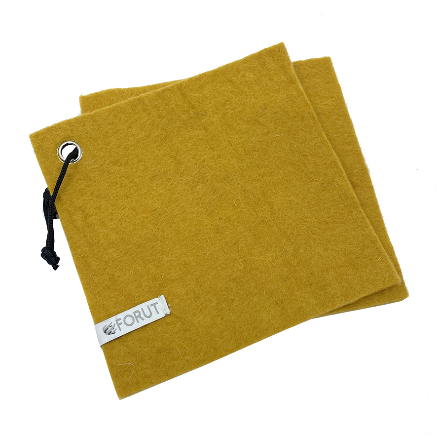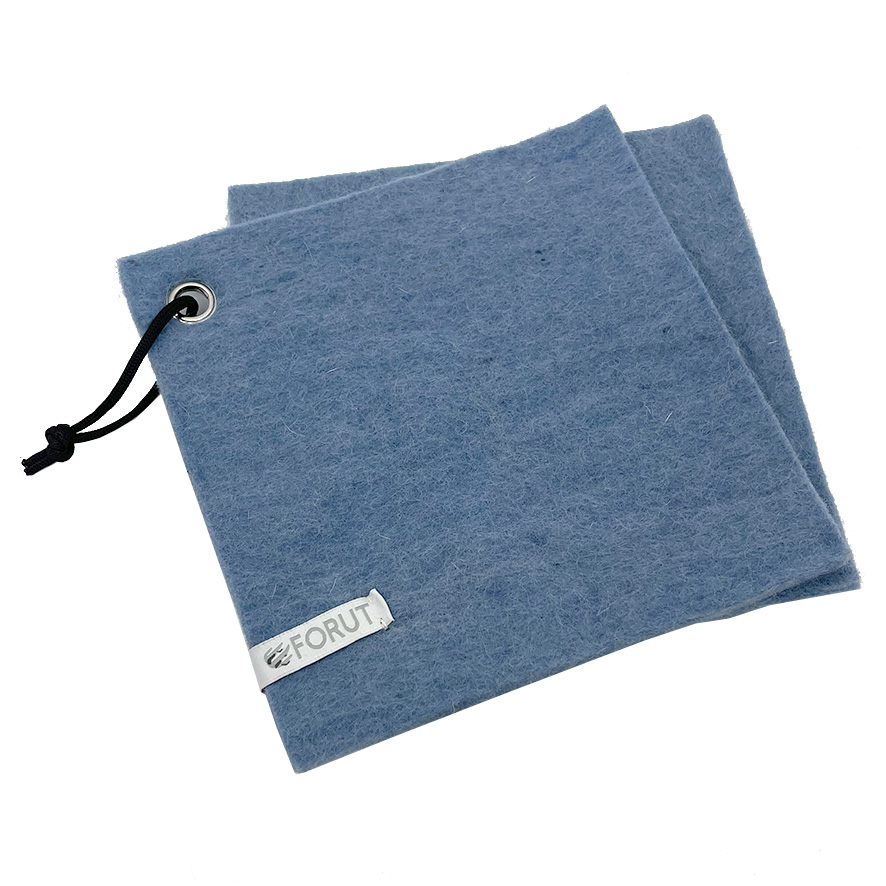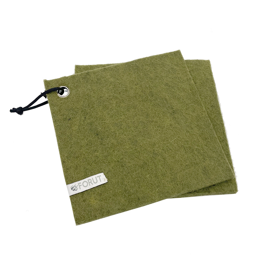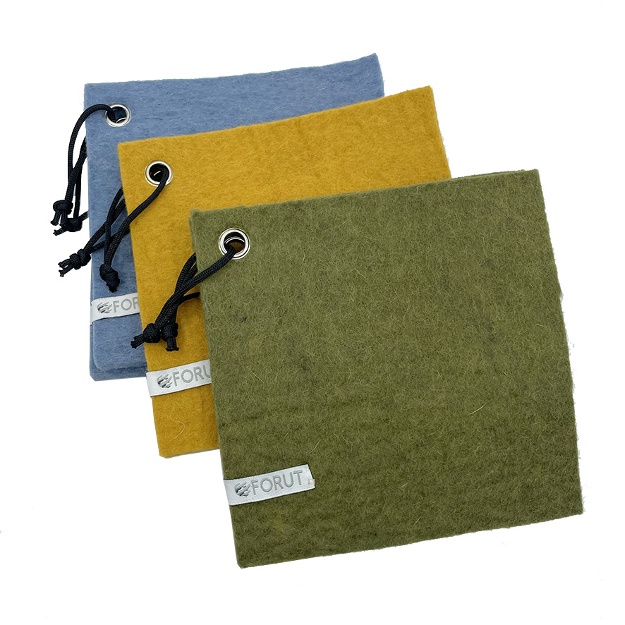 Grytekluter i tovet filt. Gryteklutene måler ca. 18×18 cm. Hull forsterket med malje og hempe for oppheng i det ene hjørnet. Fås i tre ulike farger: Olivengrønn, okergul og blå. (Fargegjengivelsen på skjerm kan avvike fra virkeligheten). Produsert for FORUT av Nepal Craft Gallery i Katmandu.