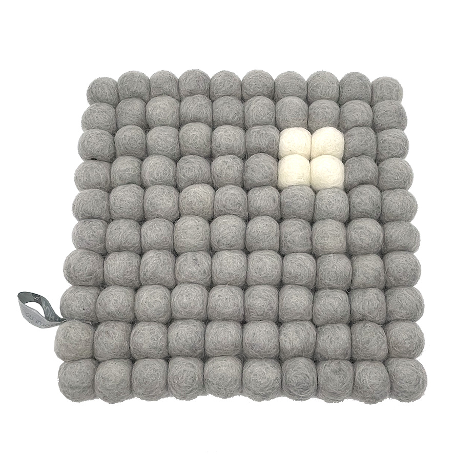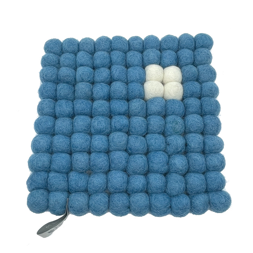 Gryteunderlagene er 20X20 cm. og satt sammen av 2 cm håndlagde filtkuler. Fås i fire ulike farger. (Fargegjengivelsen på skjerm kan avvike fra virkeligheten). Produsert for FORUT av Nepal Craft Gallery i Katmandu.